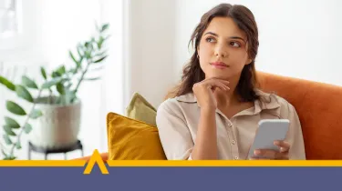 • Kobieta zastanawiająca się na tle tablicy z narysowanymi znakami zapytania, symbolizująca wątpliwość lub potrzebę podjęcia decyzji finansowej.